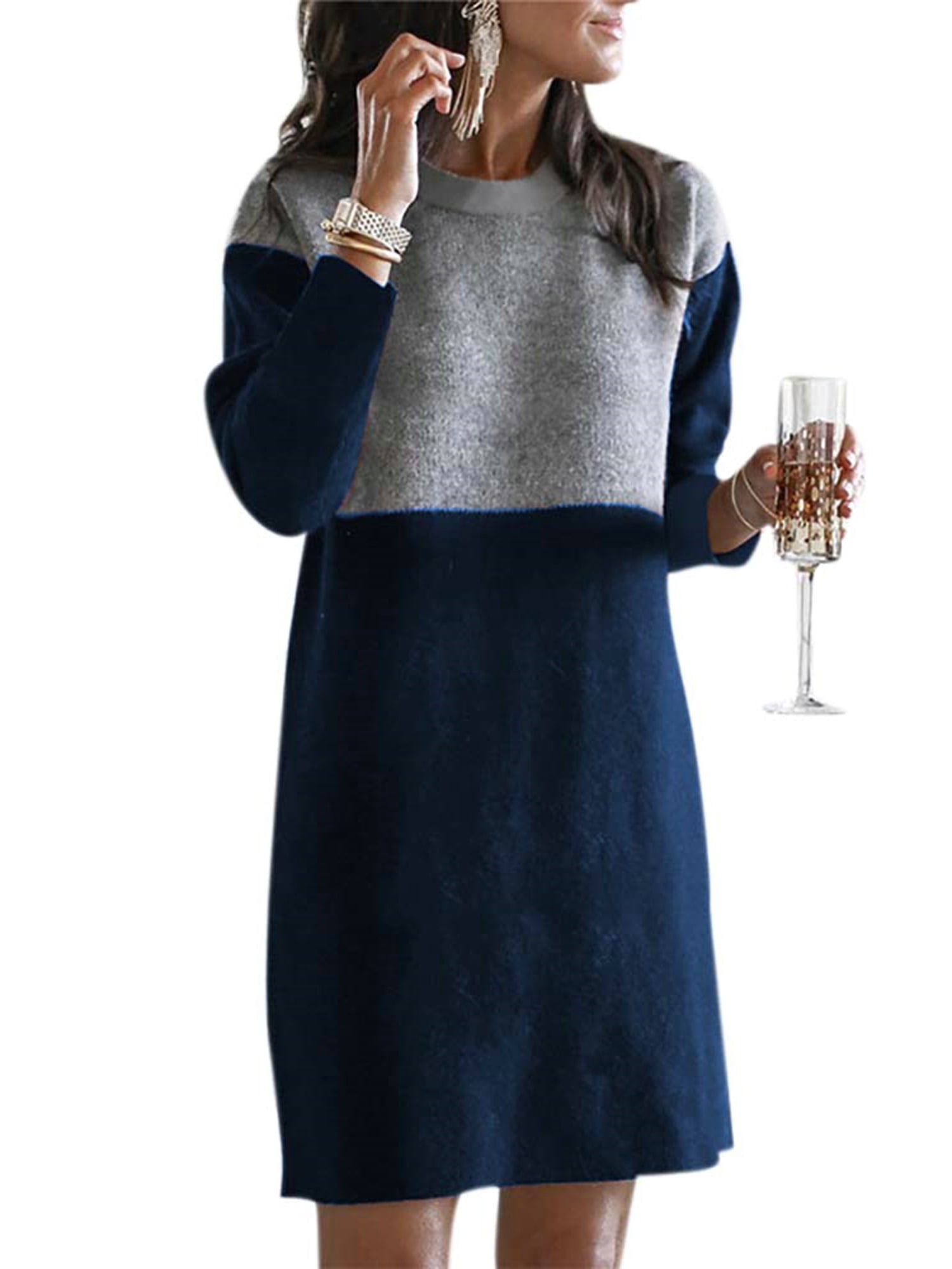 Women S Winter Patchwork Long Sleeve Woolen Jumper Dress Casual Mini Shift Dress Walmart Com